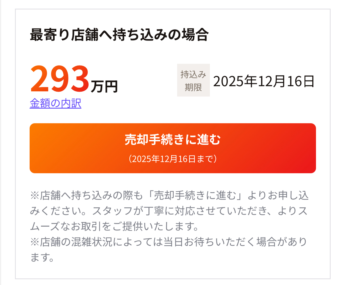 店舗持ち込みだと大体5万ほど高く、そして査定額の有効期限は5日〜10日ほどしかありません。