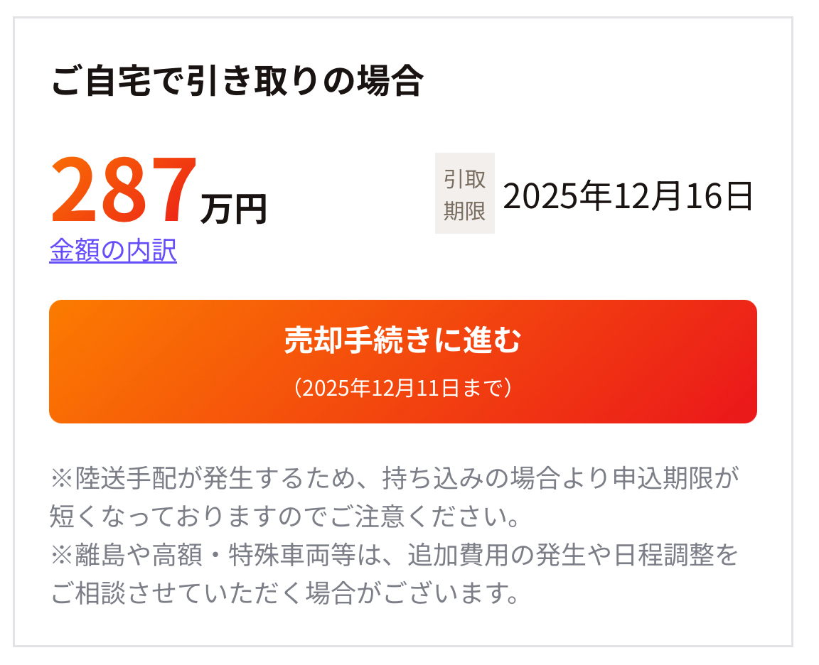 自宅引き取りが大体5万ほど低いので、輸送費は5万ほどですね^^