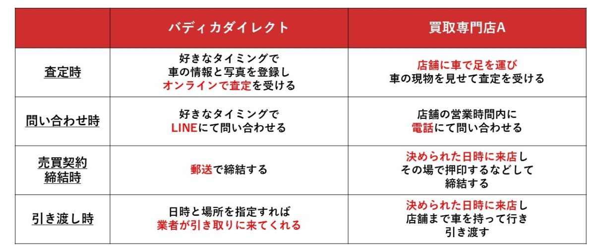 そこで、バディカダイレクトの手続きがいかに手軽なのかをより明確にするため、他の買取専門店で車を売却した場合と比較してみましょう。